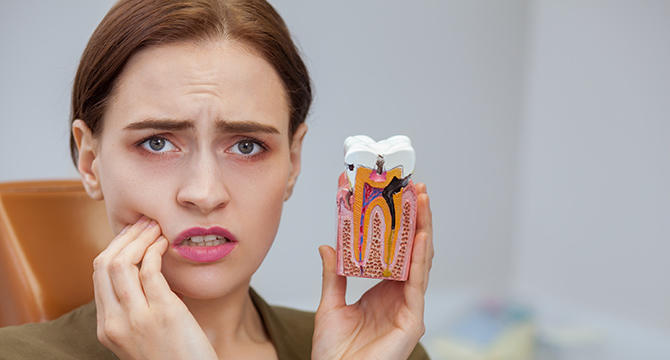 Endodontic therapy is a sequence of treatment for the pulp of a tooth which results in the elimination of infection and protection of the decontaminated tooth from future microbial invasion. This set of procedures is commonly referred to as a “root canal”. Root canals and their associated pulp chamber are the physical hollows within a tooth that are naturally inhabited by nerve tissue, blood vessels and other cellular entities. Endodontic therapy involves the removal of these structures, the subsequent cleaning, shaping, and decontamination of the hollows with tiny files and irrigating solutions, and filling of the decontaminated canals with a filling.